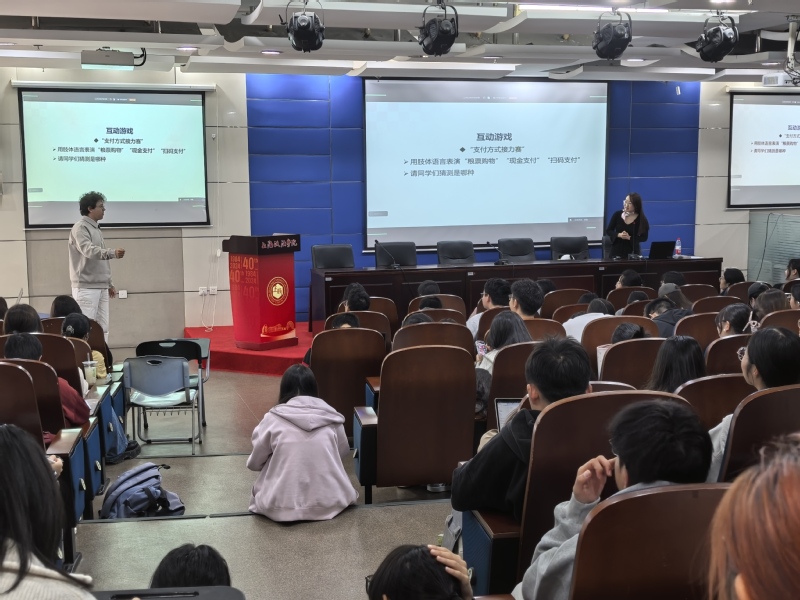 讲座以“你眼中最具特色的中国消费方式”投票开场,手机支付、外卖服务、直播购物、共享单车等选项引发留学生积极回应。现场通过举手统计与实物展示粮票、现金、二维码、直播设备的方式呈现从“粮票到二维码”的消费变迁,引出对中国消费变革的深入思考。